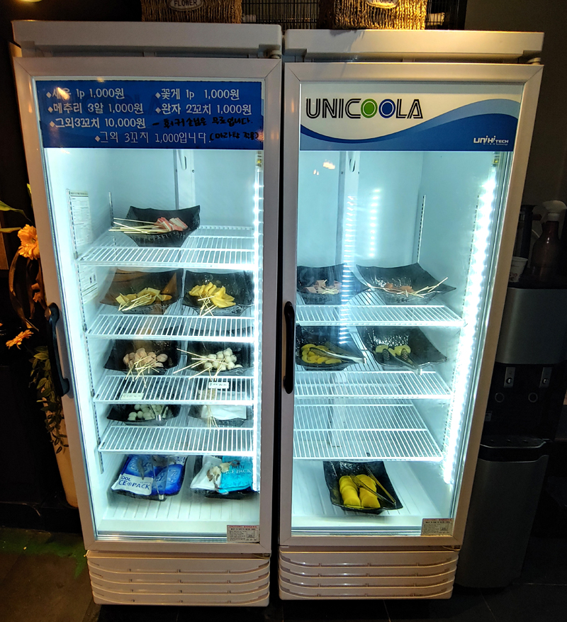 음료 냉장고에 꼬치류가 있네요.