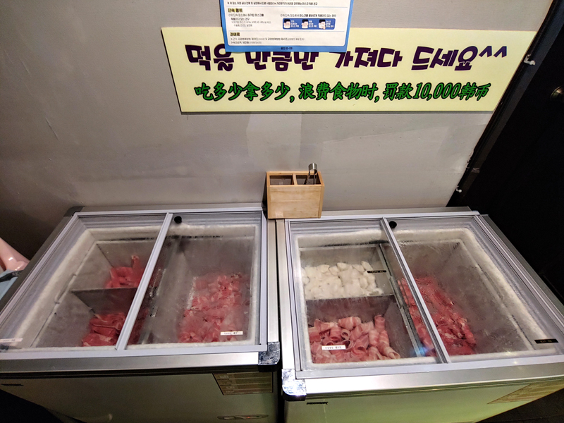 소고기, 양고기, 돼지고기, 만두가 냉동고에 자리하고 있습니다.