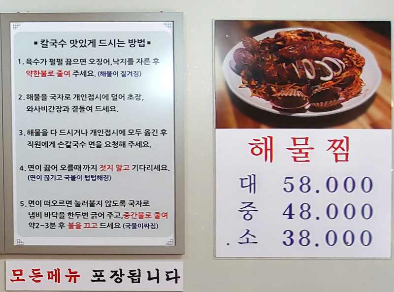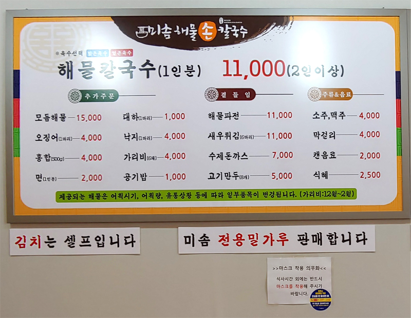 가게 간판에 맞게 메인메뉴는 해물칼국수이구요,