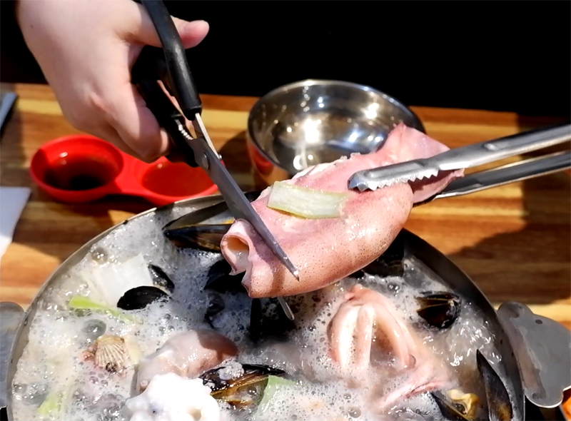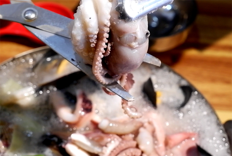 팔팔 끓어 오징어와 낙지 등을 자르고 불을 줄여줍니다.