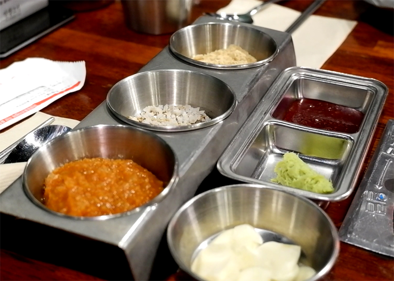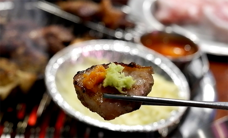 덜미살에 와사비와 마늘쌈장을 태우고 입안으로 항해를 떠납니다.