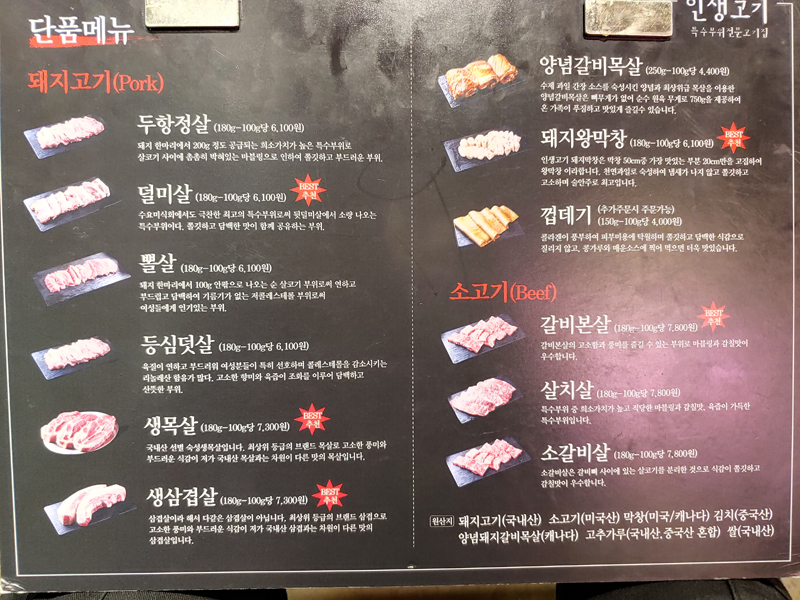 뒷면엔 메뉴에 있는 고기의 설명이 있군요.