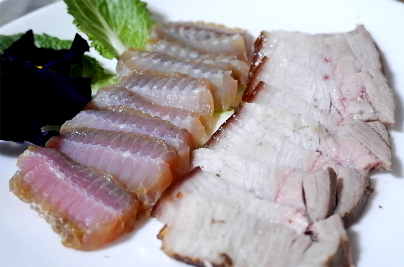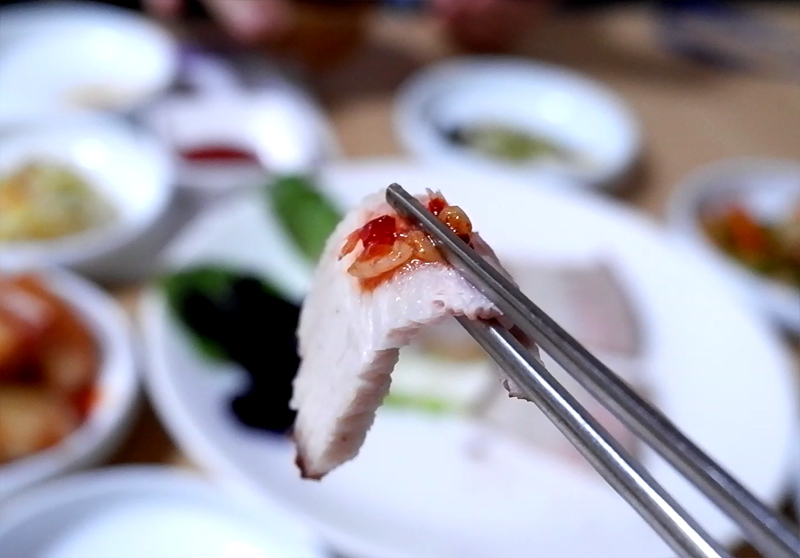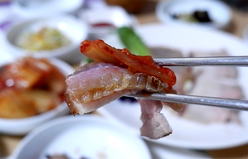 때깔이 좋고, 수육은 껍질이 있는 오겹살이다.
