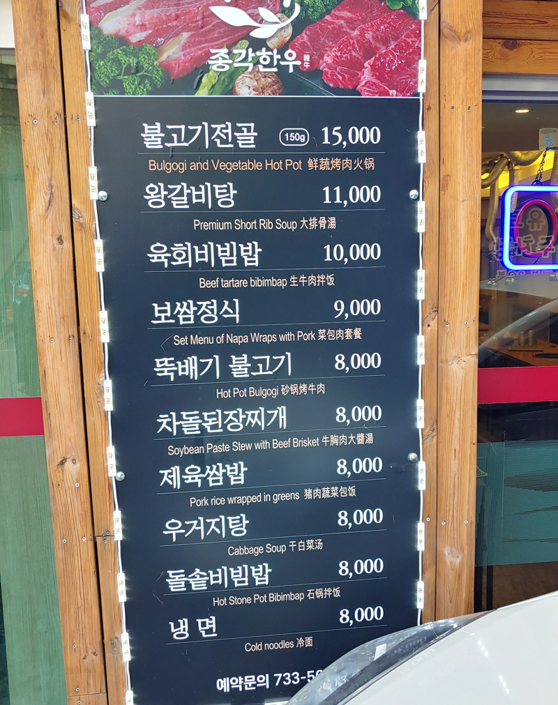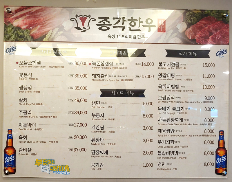 종로고기집 종각한우의 메뉴입니다.