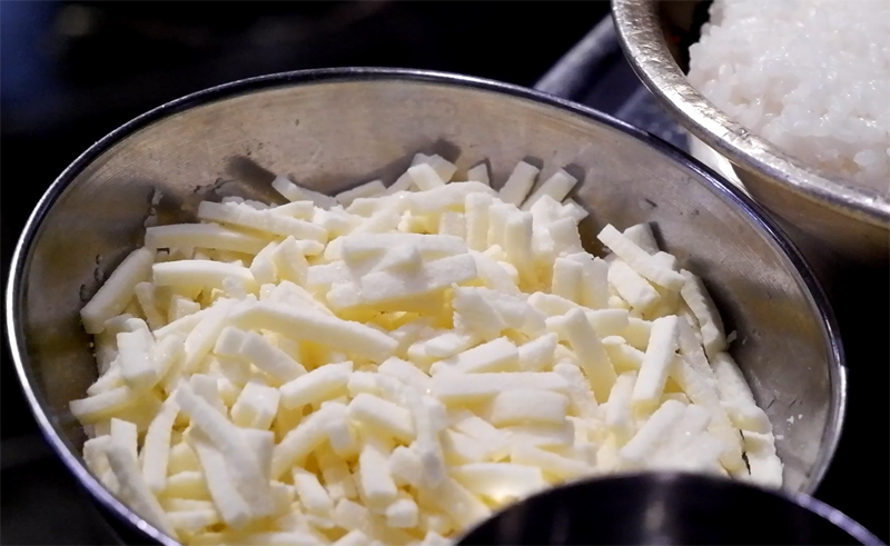 밥이 다 볶아지면 준비된 모짜렐라 치즈를 주위에 뿌려줍니다.