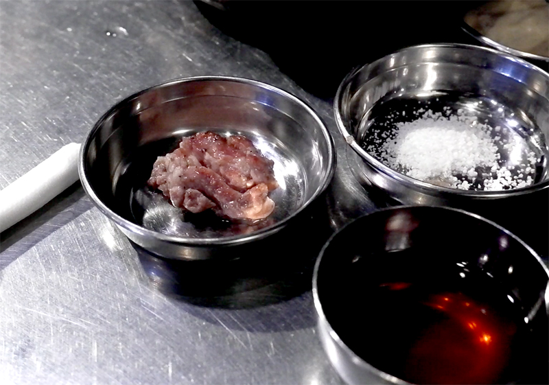먼저 트러플 소금에 찍어 순수한 고기맛을 보라고 하는군요.