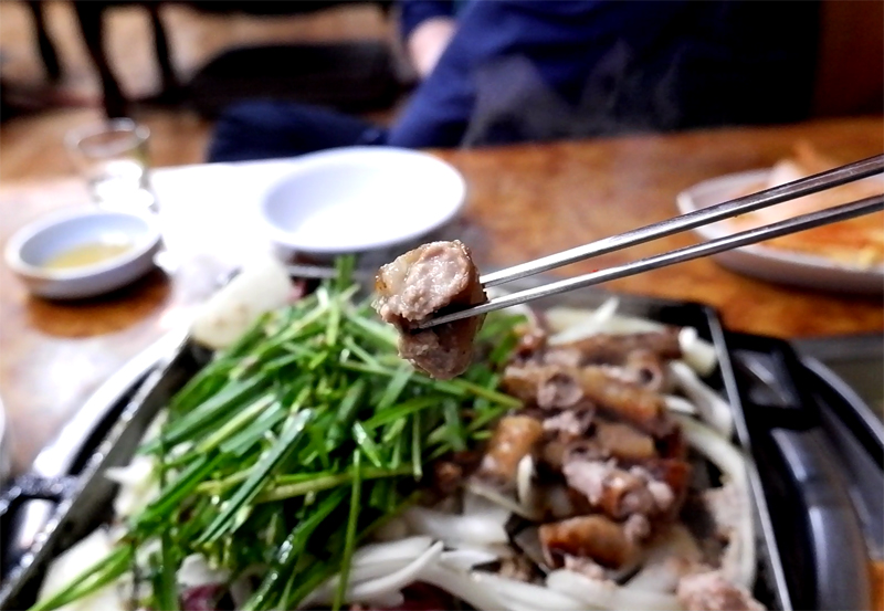 어떤 집의 곱창은 이 정도로 익히면 질겅거리기만 하고 잘 안끈어지는 경우가 있습니다만...