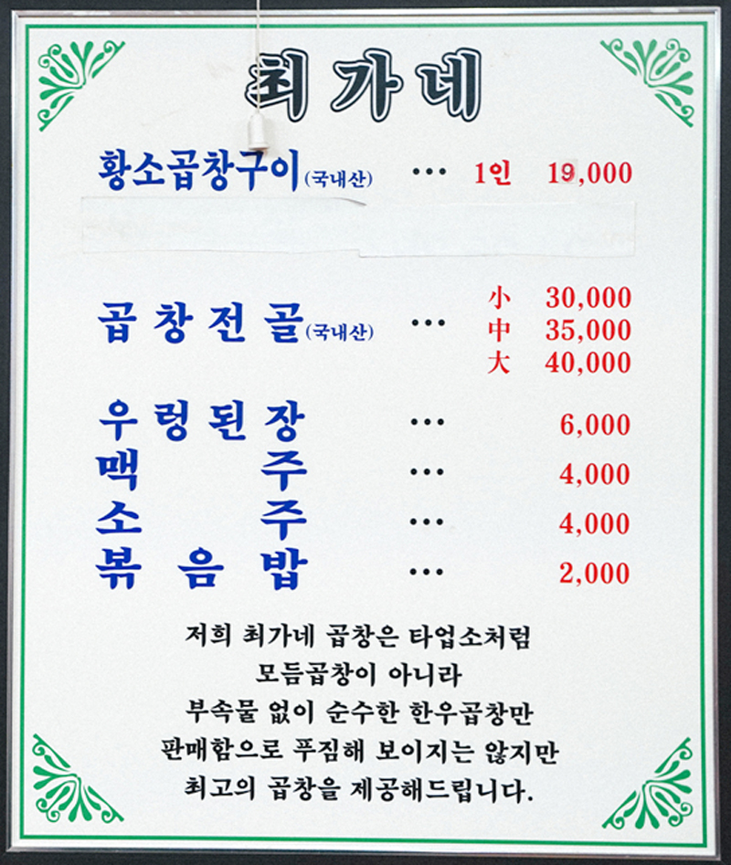 종로3가곱창 최가네 황소곱창의 메뉴판입니다.