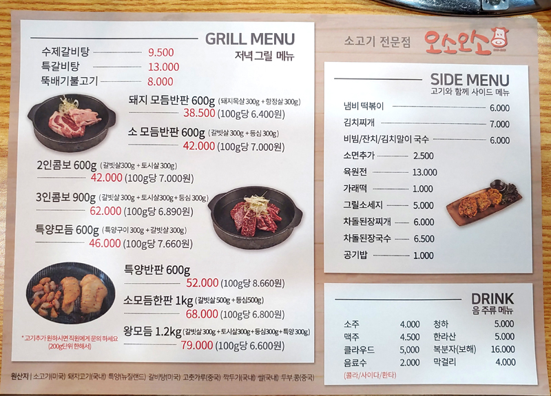 상암갈비살 오소오소 상암점의 메뉴를 한번에 볼 수 있는 메뉴판입니다.