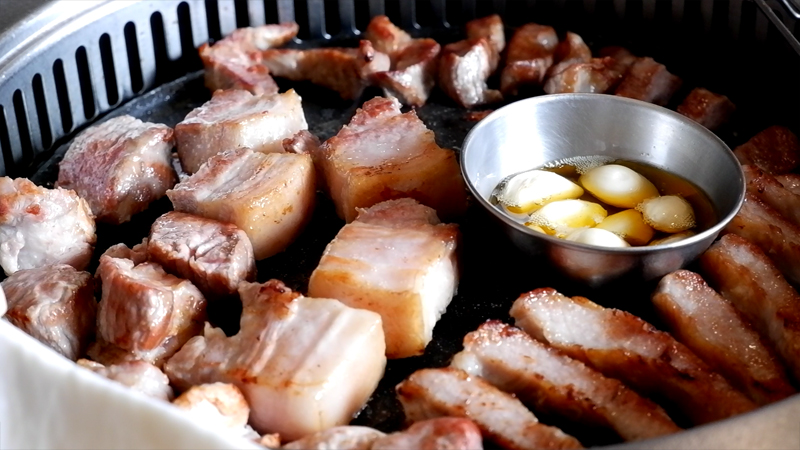 노릇노릇 고기가 익어가고 있습니다.