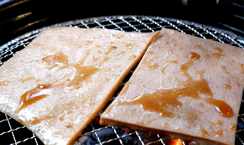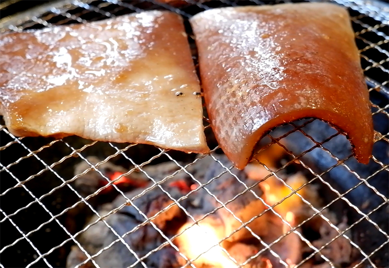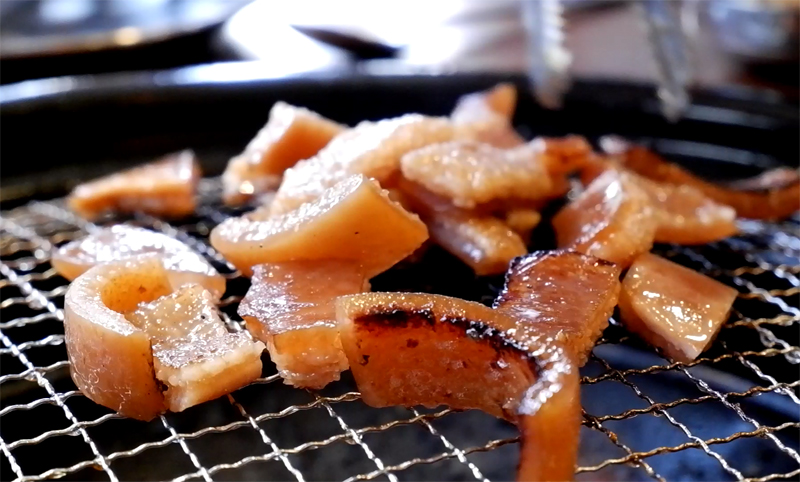 갈색빛이 돌면서 맛있게 구워지고 있는 돼지껍질.