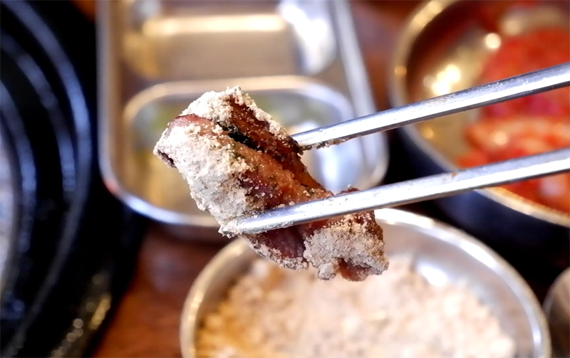 소금에 살짝 찍어 먹으니 음~ 돼지 목살의 고소함이 강조되네요.