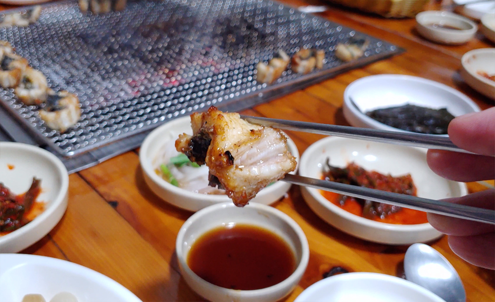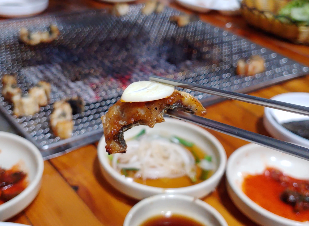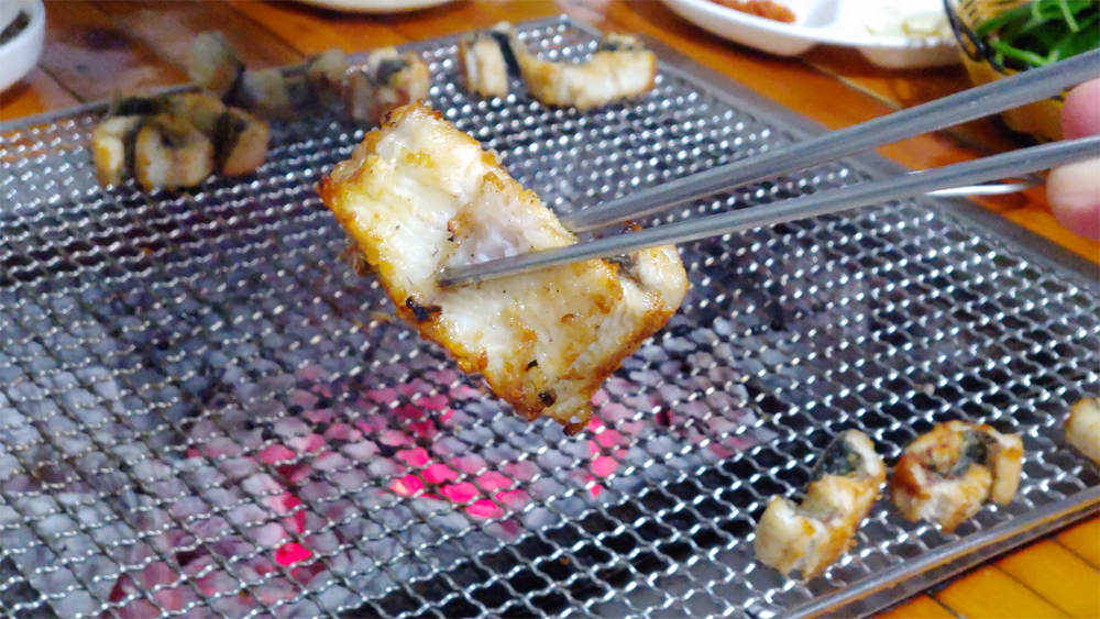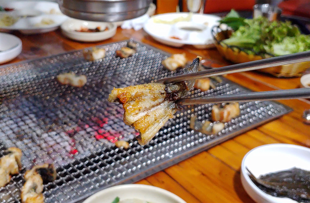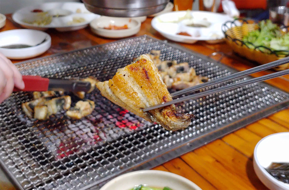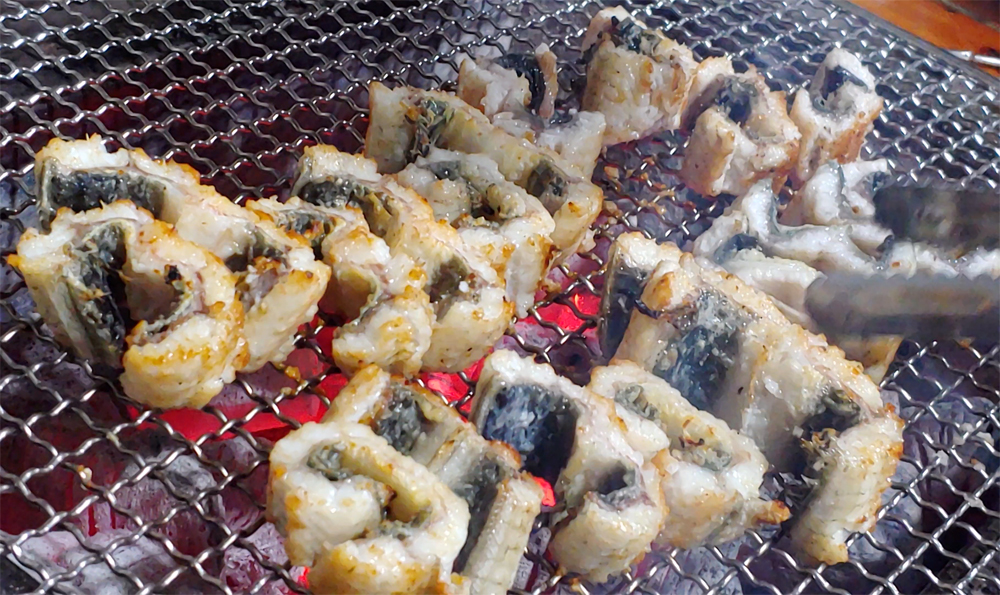 불판에 초벌구이된 장어가 나왔습니다.