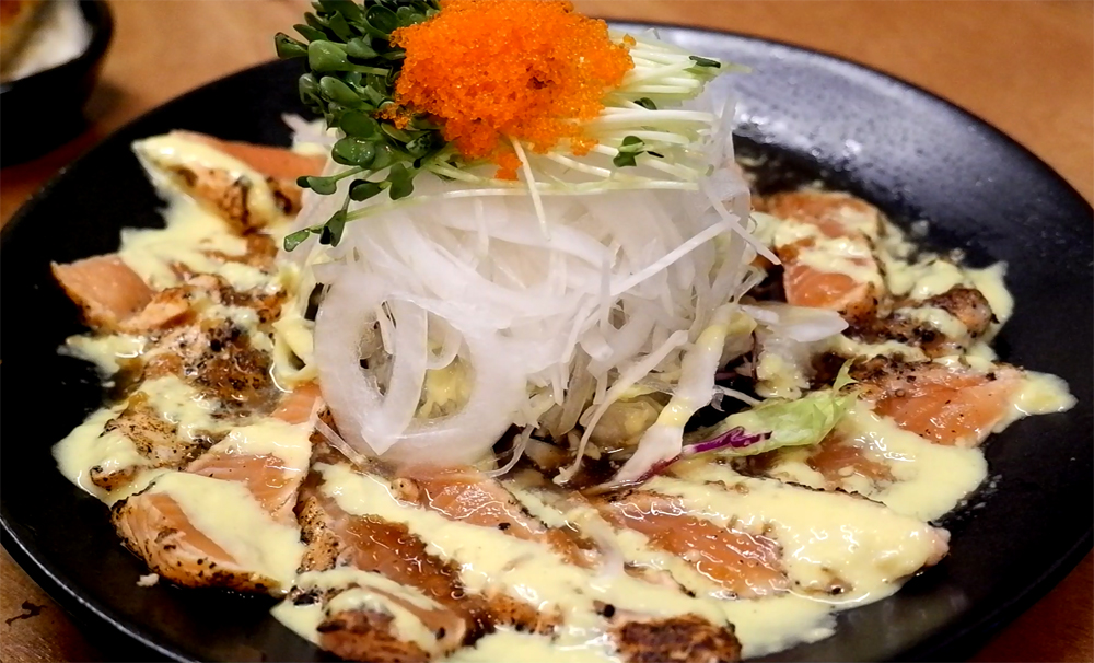 연어타다끼와 함께 먹으면... 부드러운 연어살과 아삭한 양파가 뒤섞이면서 퓨~전!