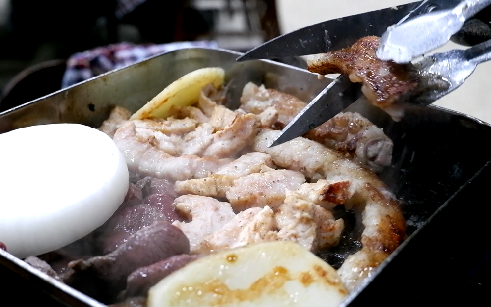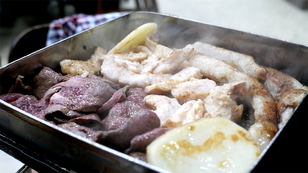 양과 곱창 염통 한 판을 먹고도 모자라서 혁년쓰가 양곱창 한 판 더 먹자는군요.