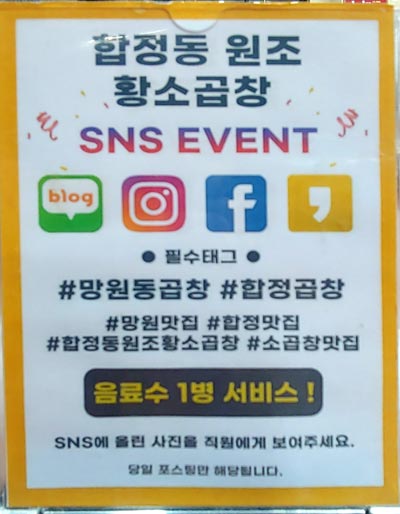 망원동곱창 합정동 원조 황소곱창에서는 이러한 이벤트도 상시 하고 있으니 참고하시구요.