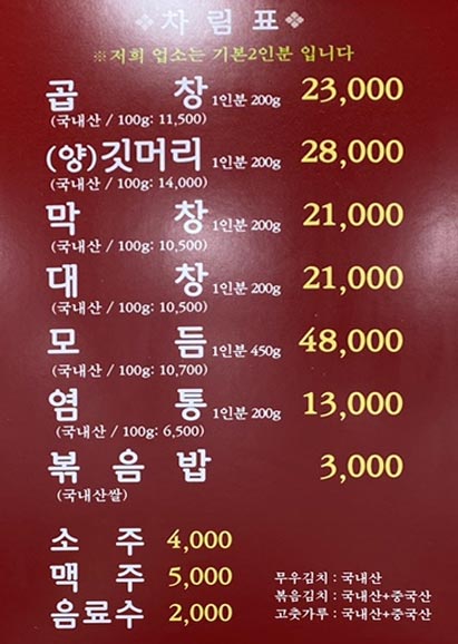 망원동곱창 합정동 원조 황소곱창의 메뉴판입니다.