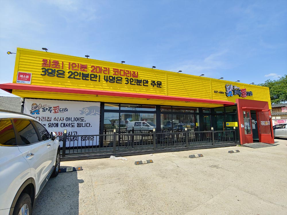 파란 하늘을 배경으로 노란 간판이 눈에 띄는 파주 운정 맛집 파주코다리.