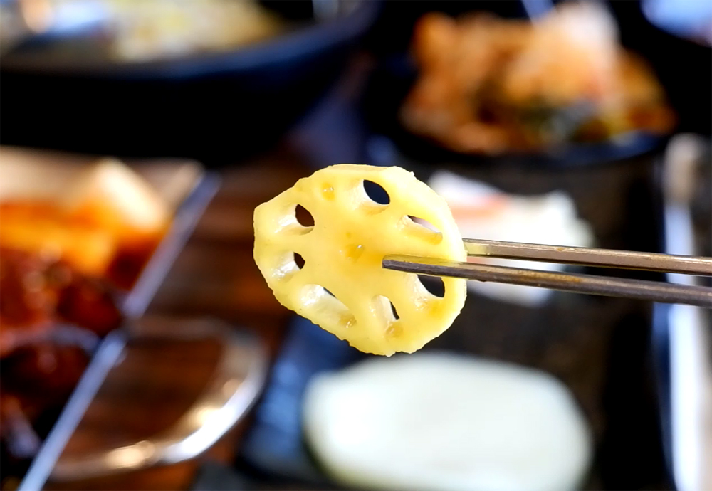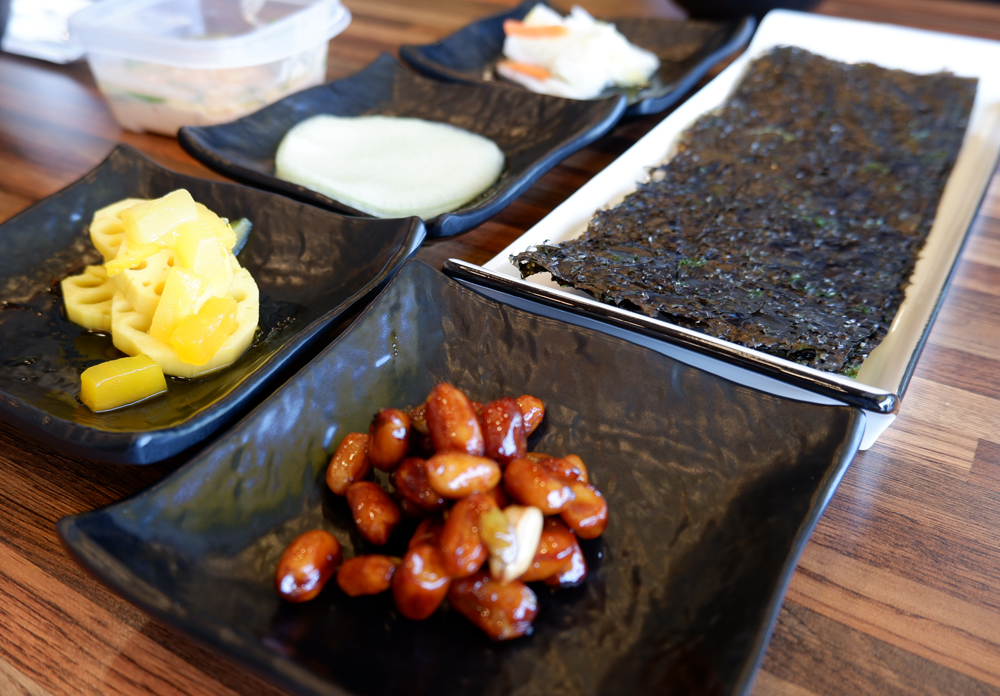 기본찬은 연근초절임, 무쌈, 땅콩볶음, 백김치 그리고 이불 같은 김이 나왔습니다.