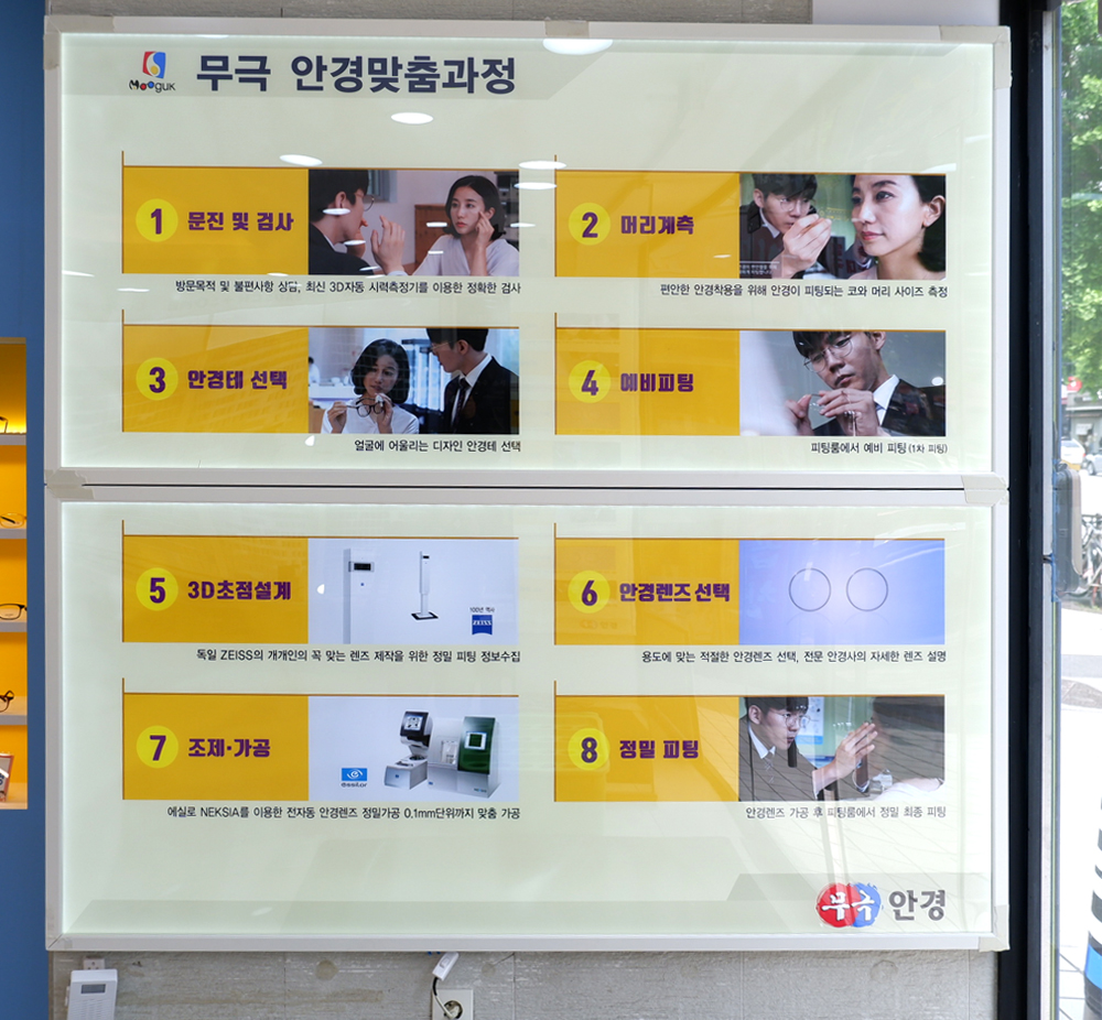 입구에 안경맞춤과정이 안내되어 있습니다.