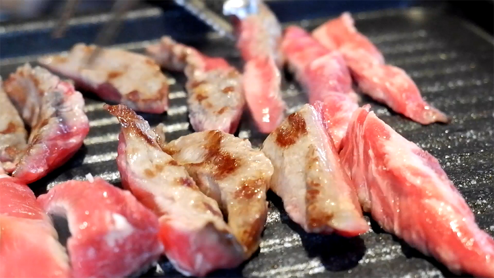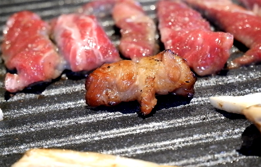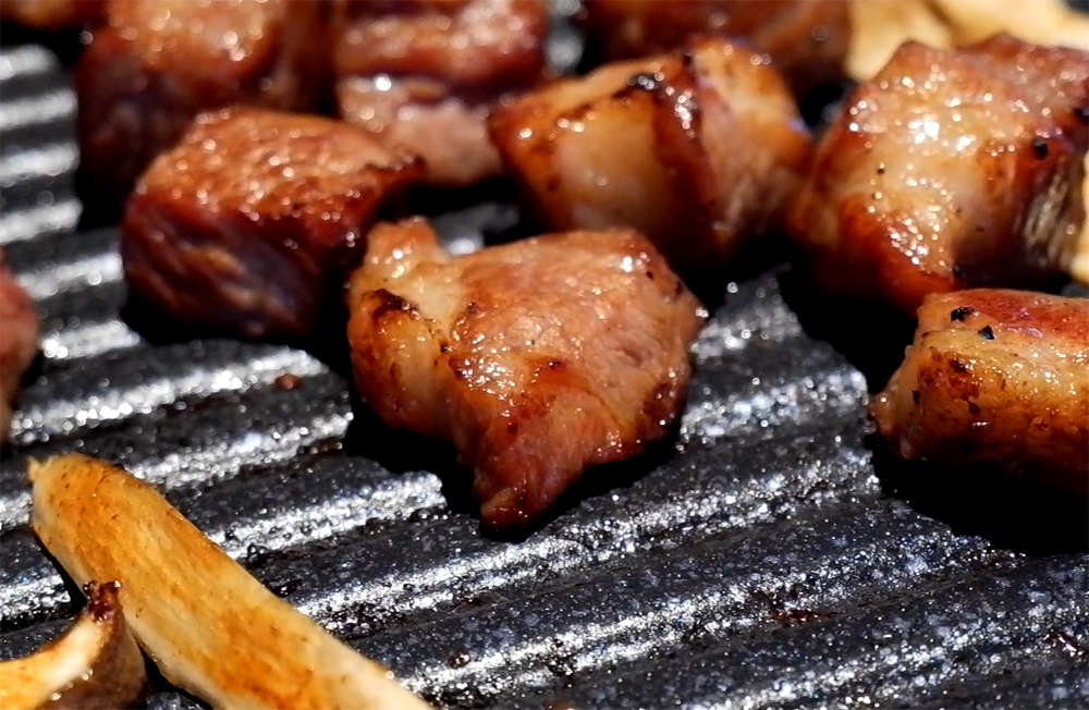 고기에서 기름이 나오면서 익어가고 있습니다.