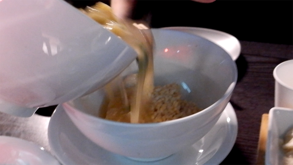 누룽지 그릇에 뜨거운 소스를 붓는 퍼포먼쓰!