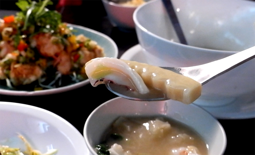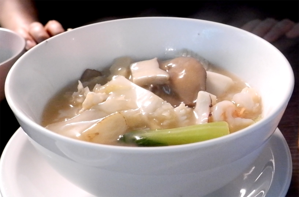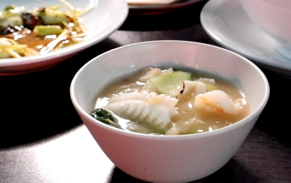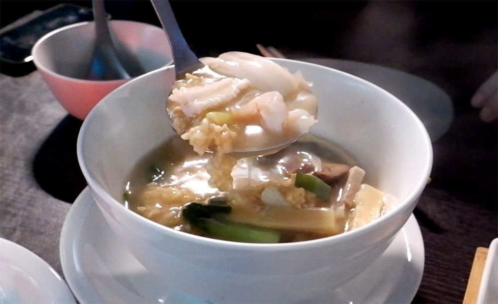 오징어, 새우, 죽순, 버섯, 청경채 등등 여러 가지 재료가 소스에 우러납니다.