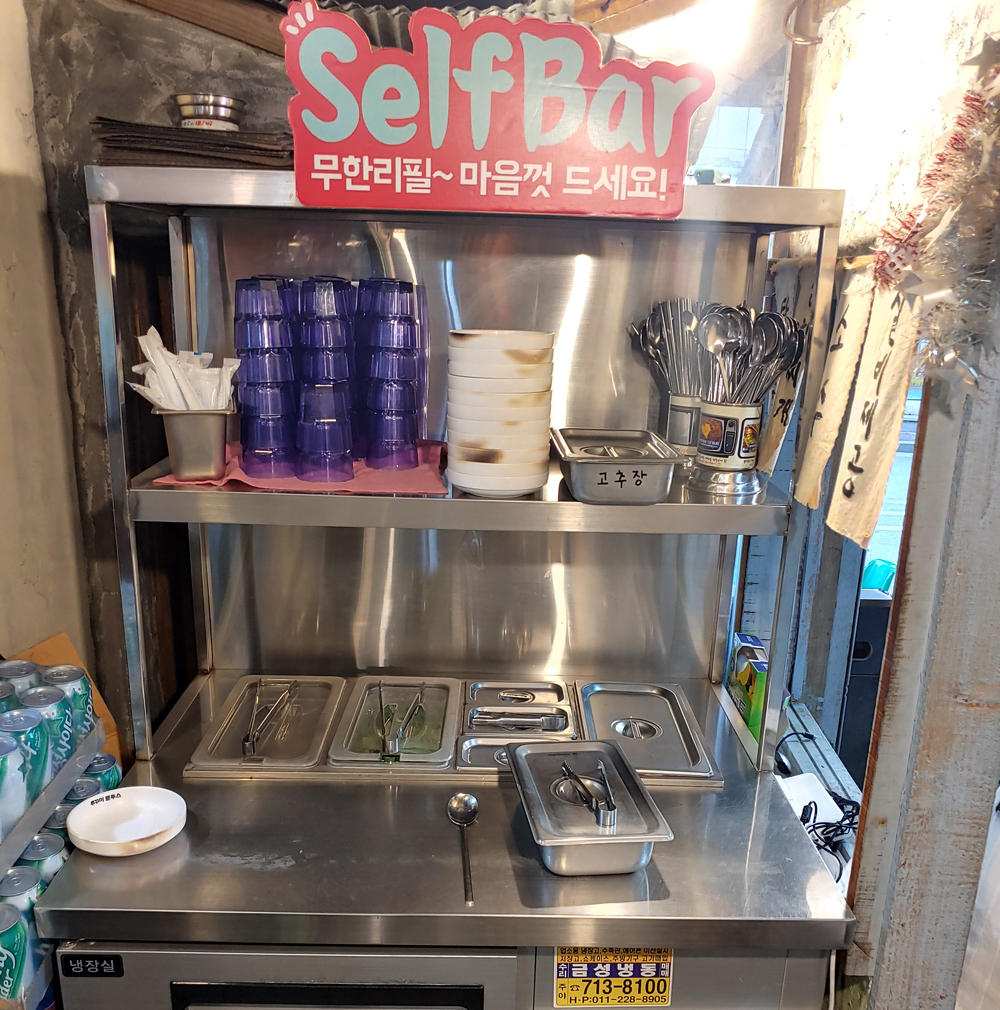 한쪽 구석엔 이와 같이 셀프 바가 있어 소스나 깻잎, 풋고추, 마늘, 알쌈이나