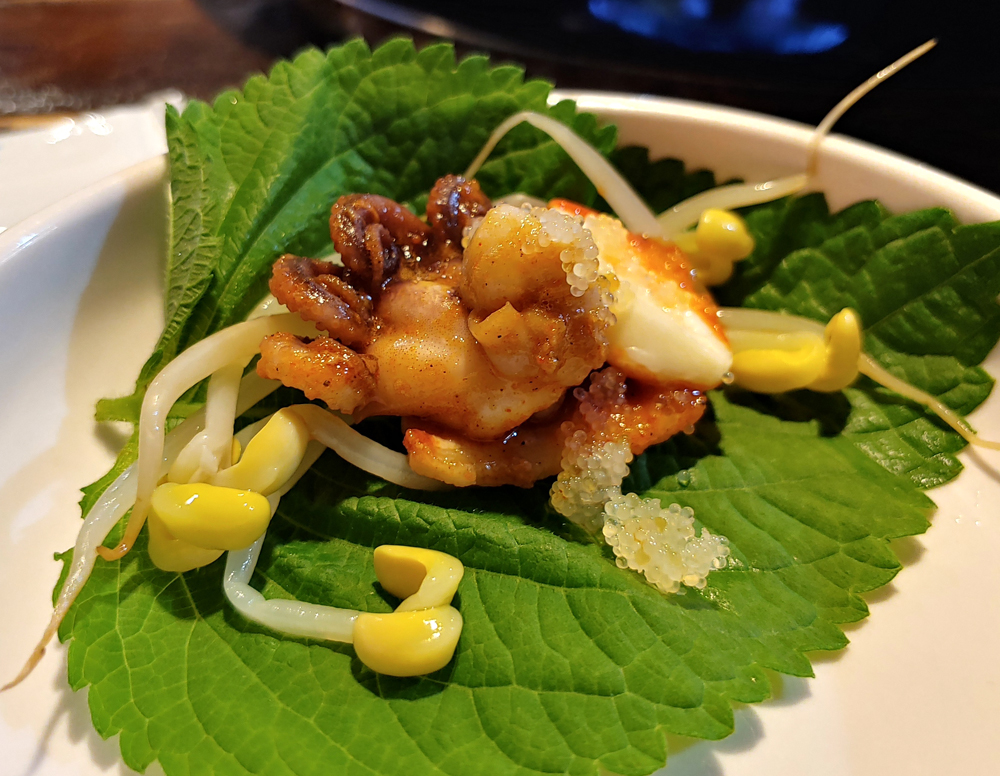 깻잎에 김깔고 삼겹살, 쭈꾸미, 콩나물, 마늘 올리고 한쌈 슛!