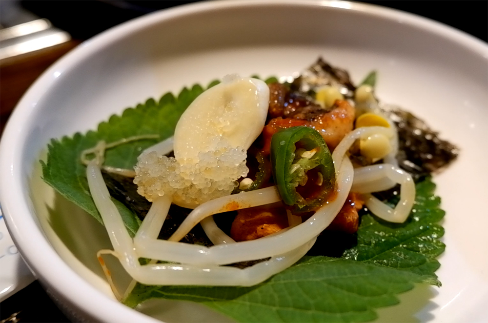 콩나물, 알쌈, 홍합탕, 마른김, 풋고추, 마늘 등이 차려지고...