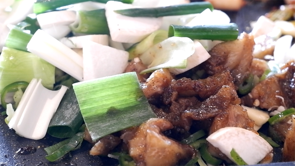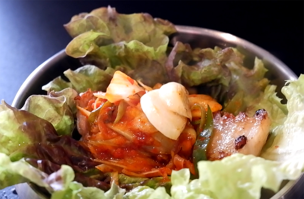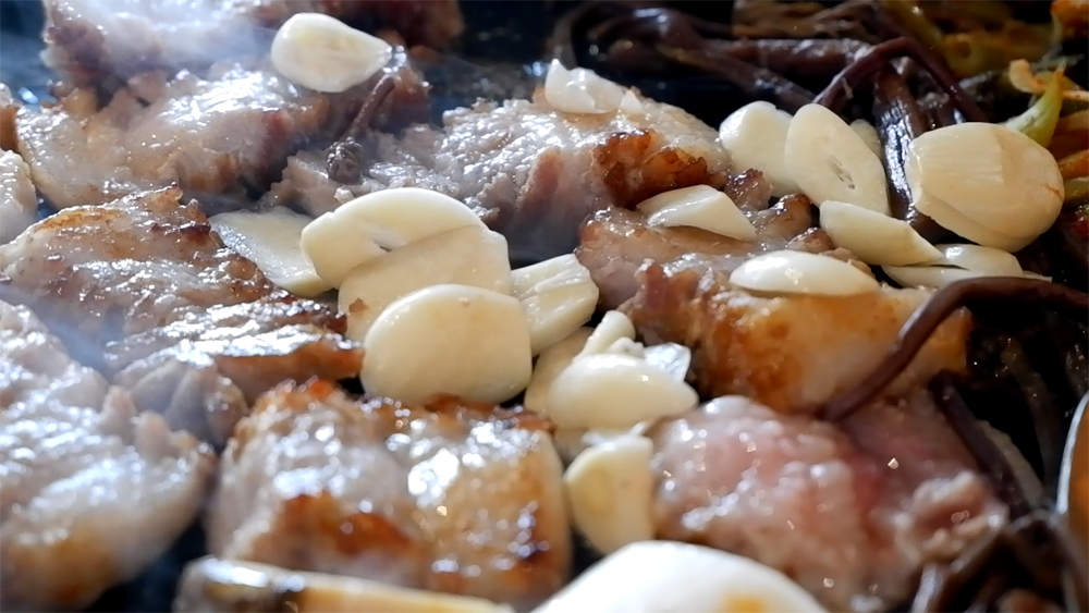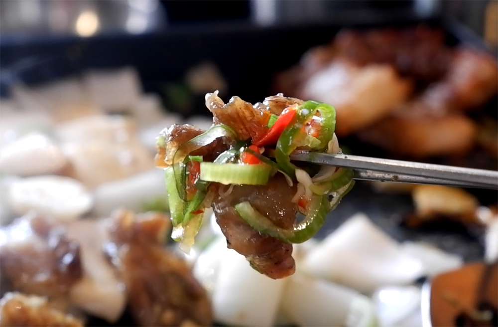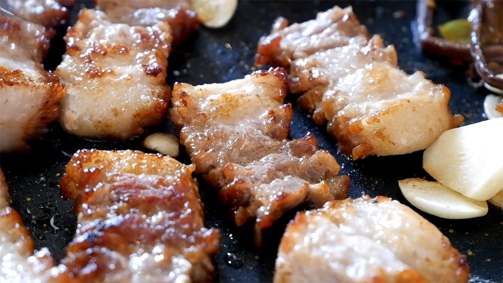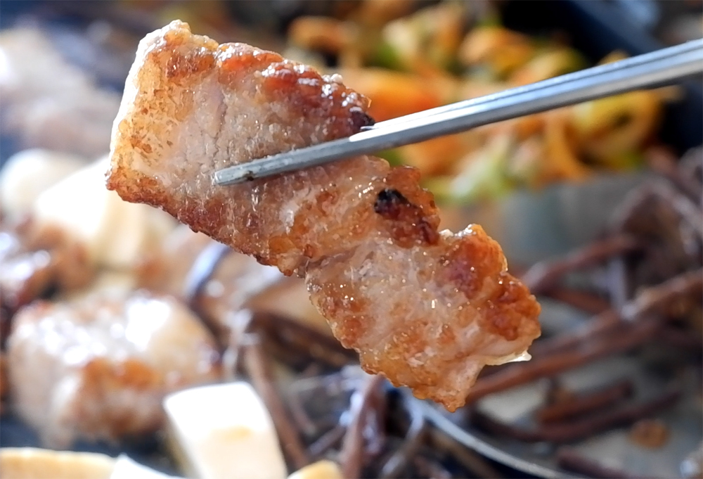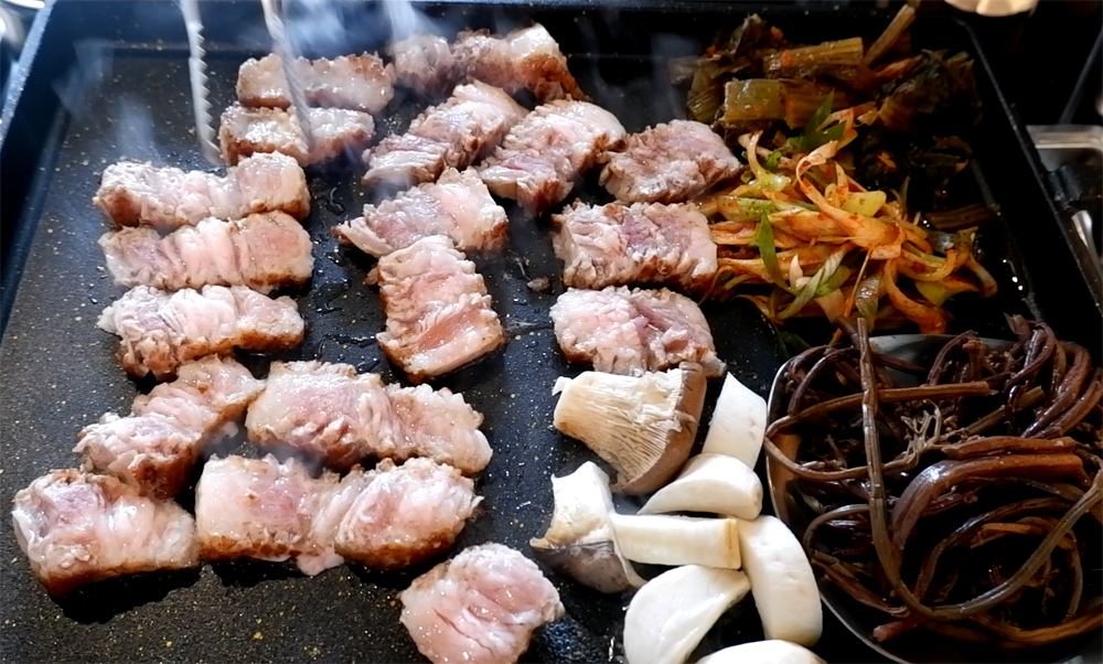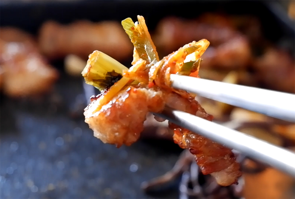 짭잘하고 고소한데다 칼칼한 청양고추의 맛이 역기 삼겹살과 잘 어울립니다.
