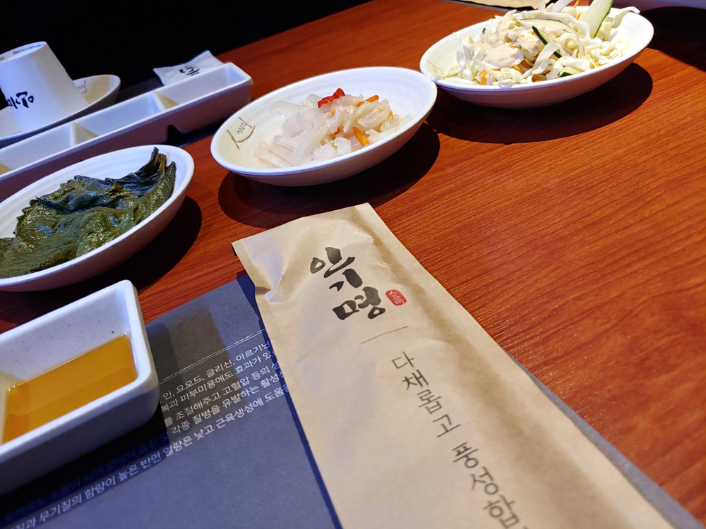 마포 술집 인기명의 기본찬은 깻잎 장아찌, 백김치, 양배추 샐러드입니다.