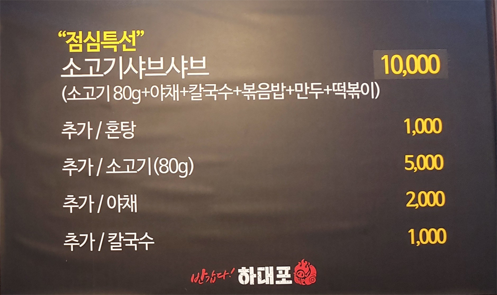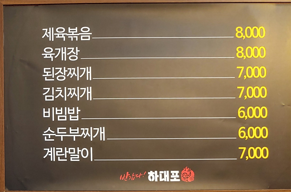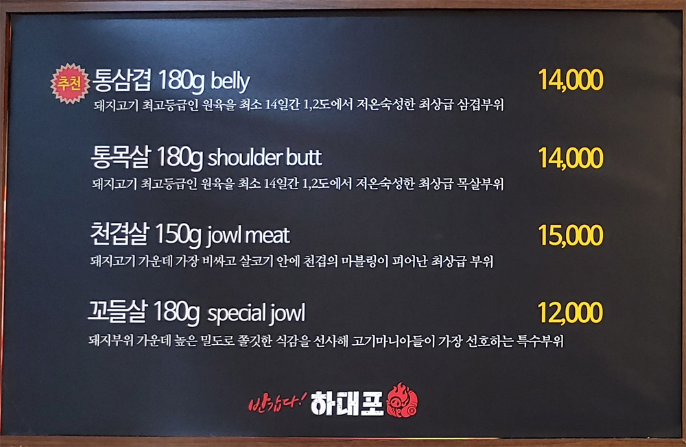 아래는 종각역 고기집 반갑다하대포 종각역점의 메뉴판입니다.