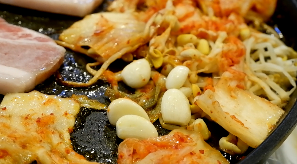그리고 기름이 잘 흐르게 기울여진 불판과 그 위에 콩나물과 김치.