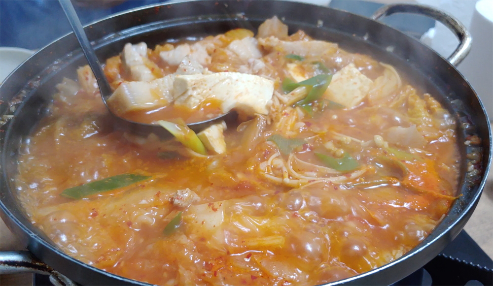 찌개엔 돼지고기, 두부, 팽이버섯 등과 기본 채소들이 들어 있습니다.