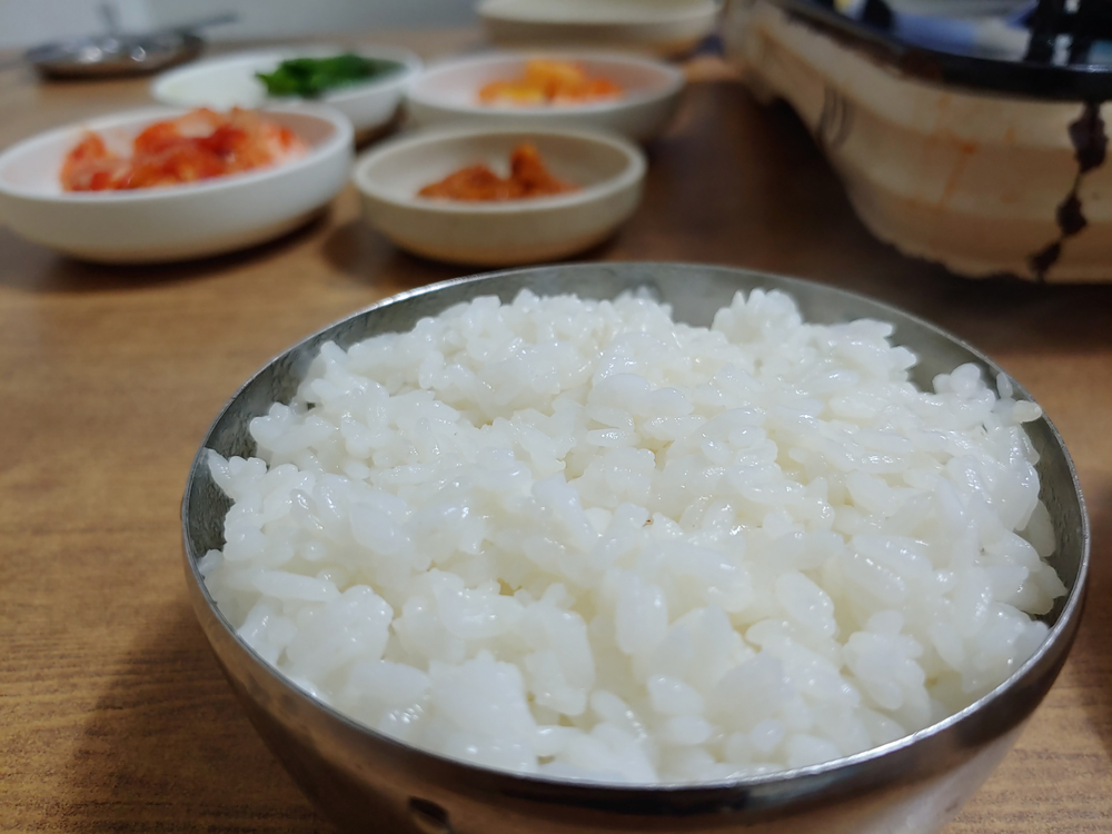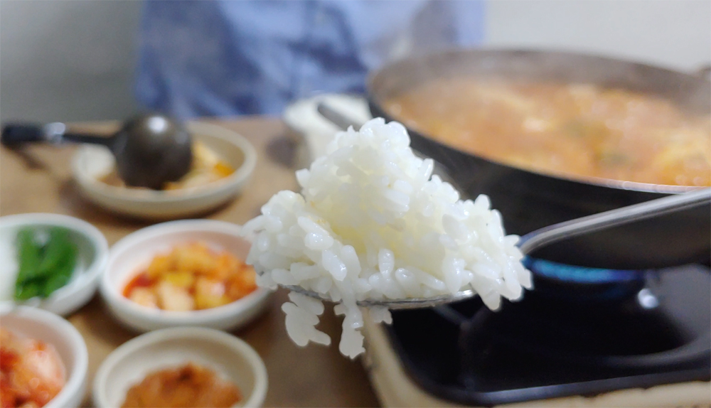 찌개가 다 끓기 전에 흰쌀밥 한술 올려봅니다.