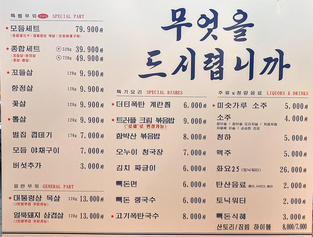 종합세트 중짜엔 뽈살, 꽃살, 항정살, 꼬들살이 있습니다.