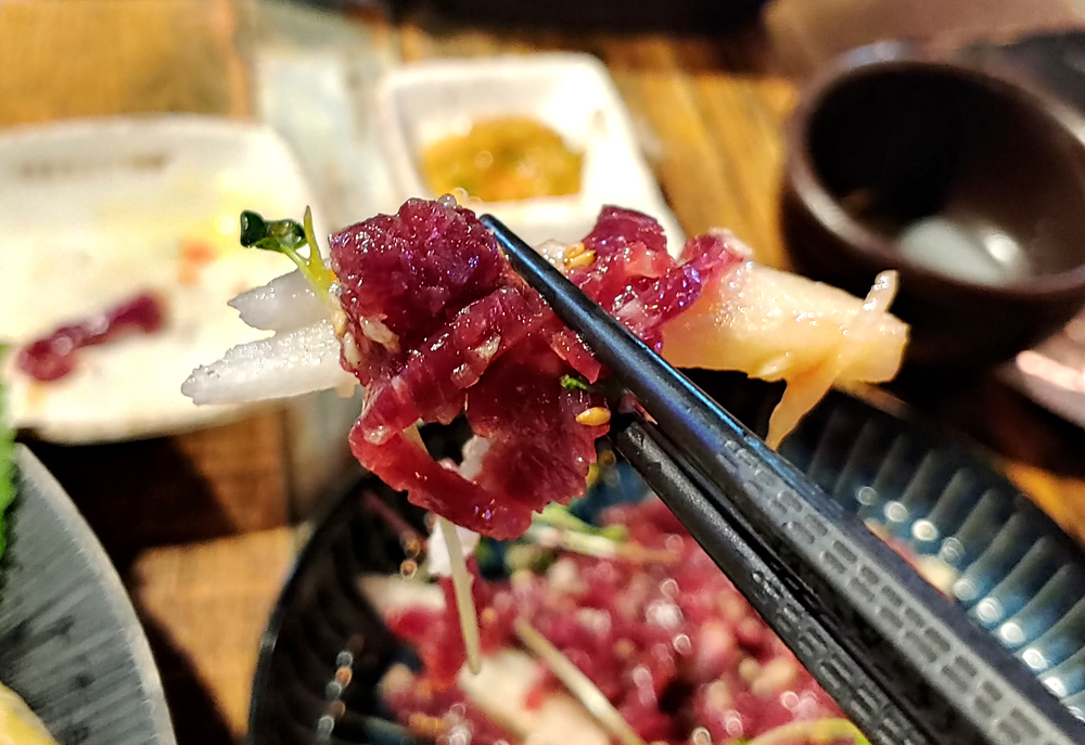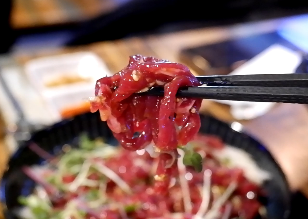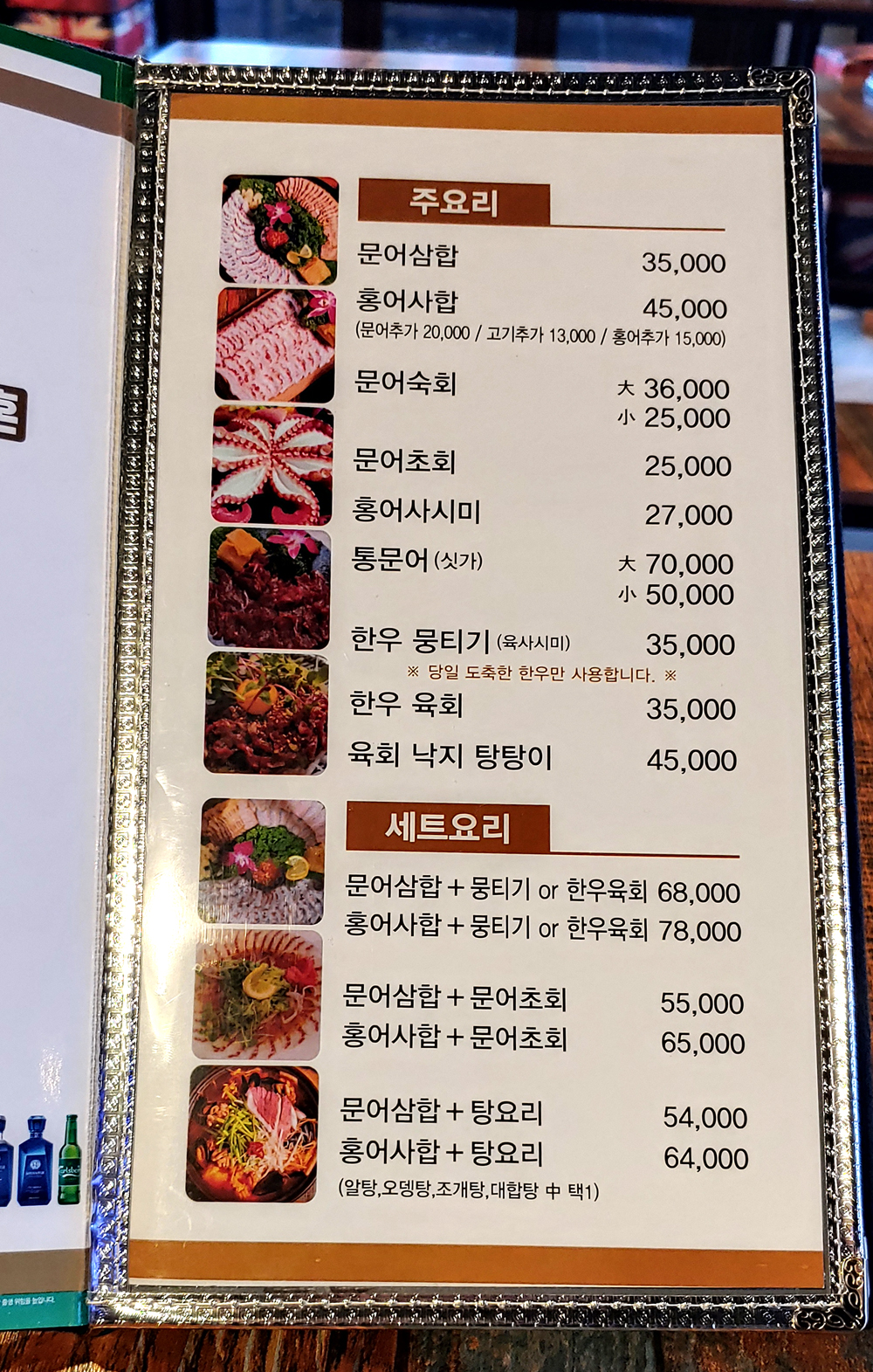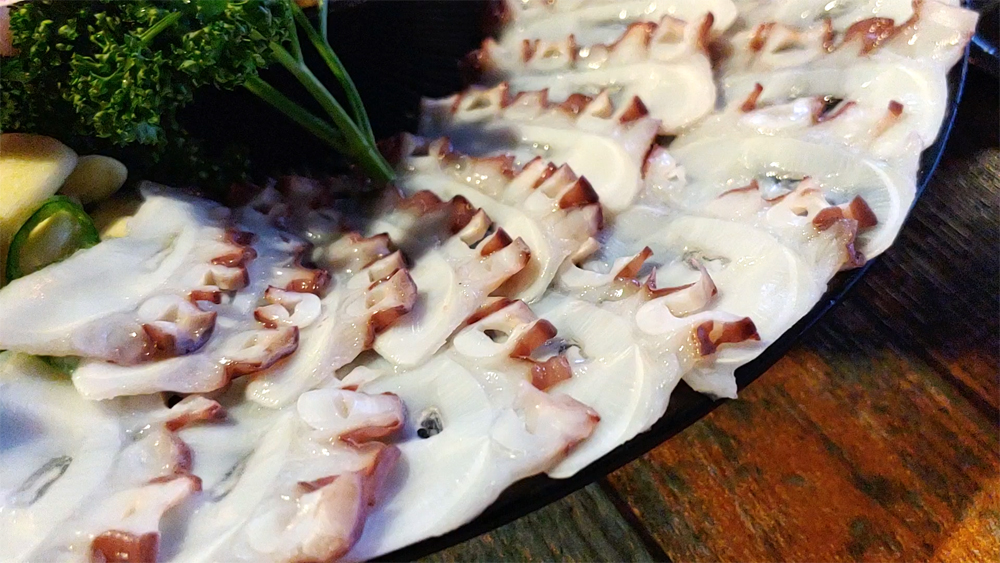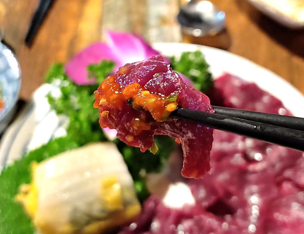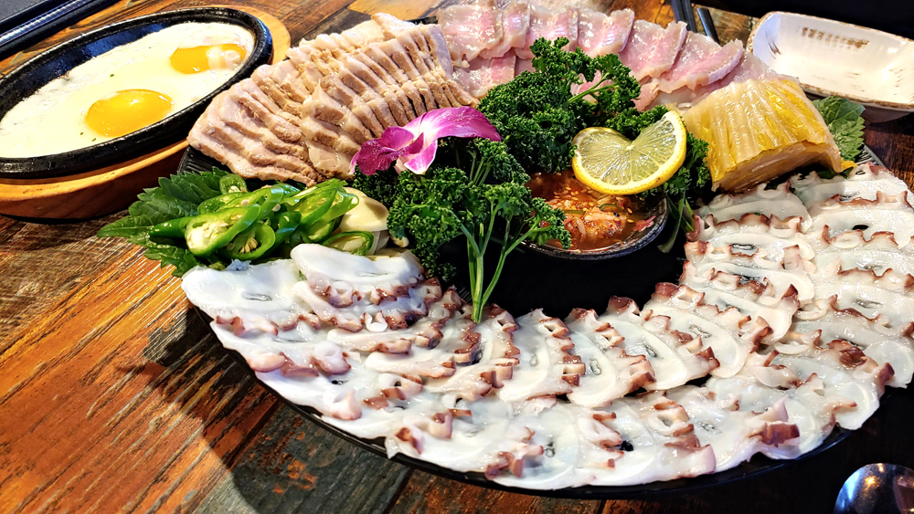 문어요리 전문점 문어랑 상록점의 홍어사합, 육회, 뭉티기, 아귀포입니다.