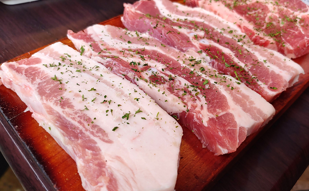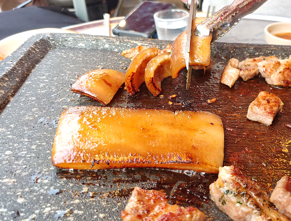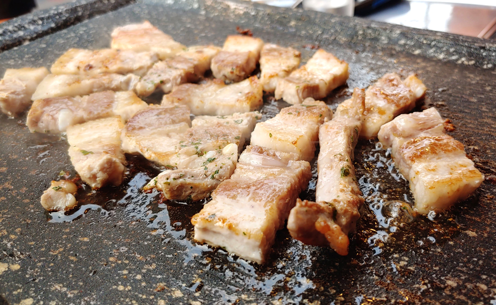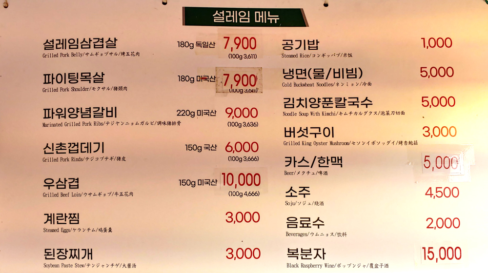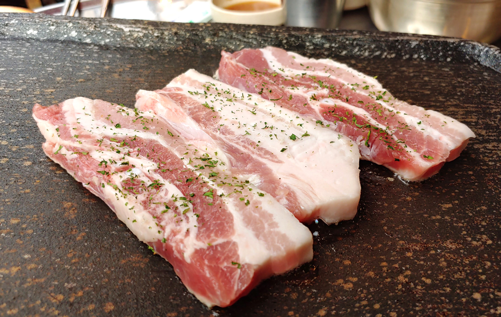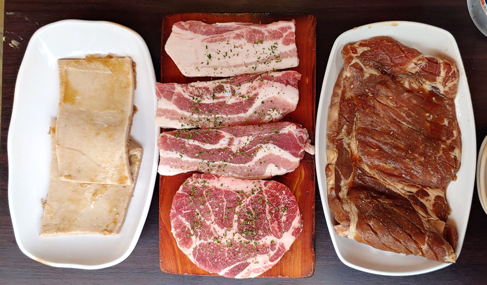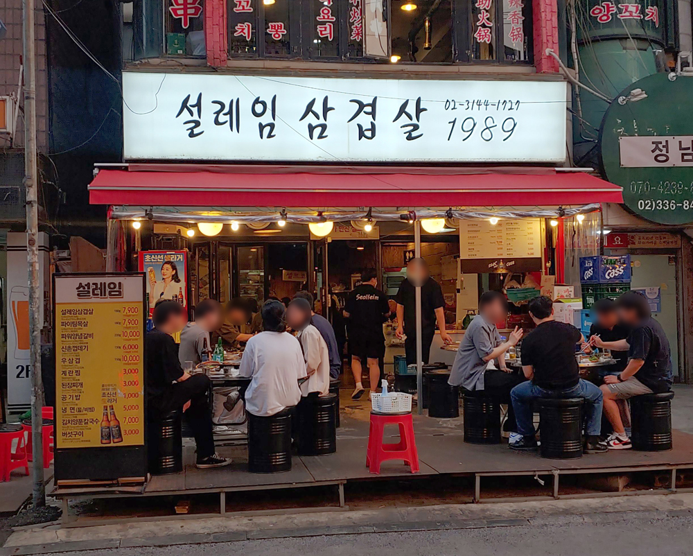 신촌 창서초등학교 앞에 있는 고깃집 설레임삼겹살 신촌점에서 삼겹살과 목살, 껍데기, 돼지양념갈비 들을 먹었습니다.