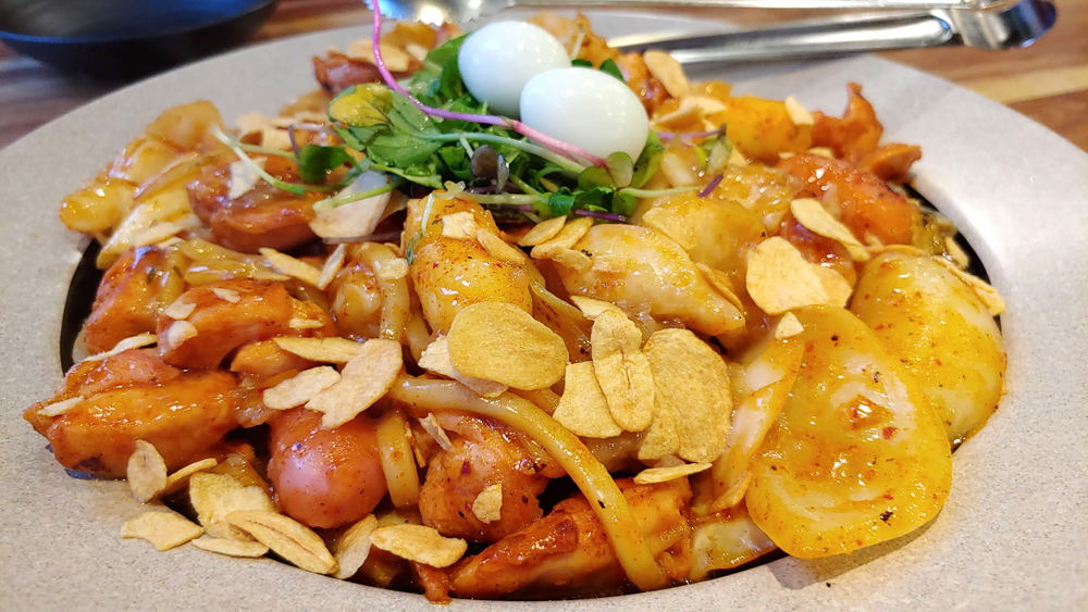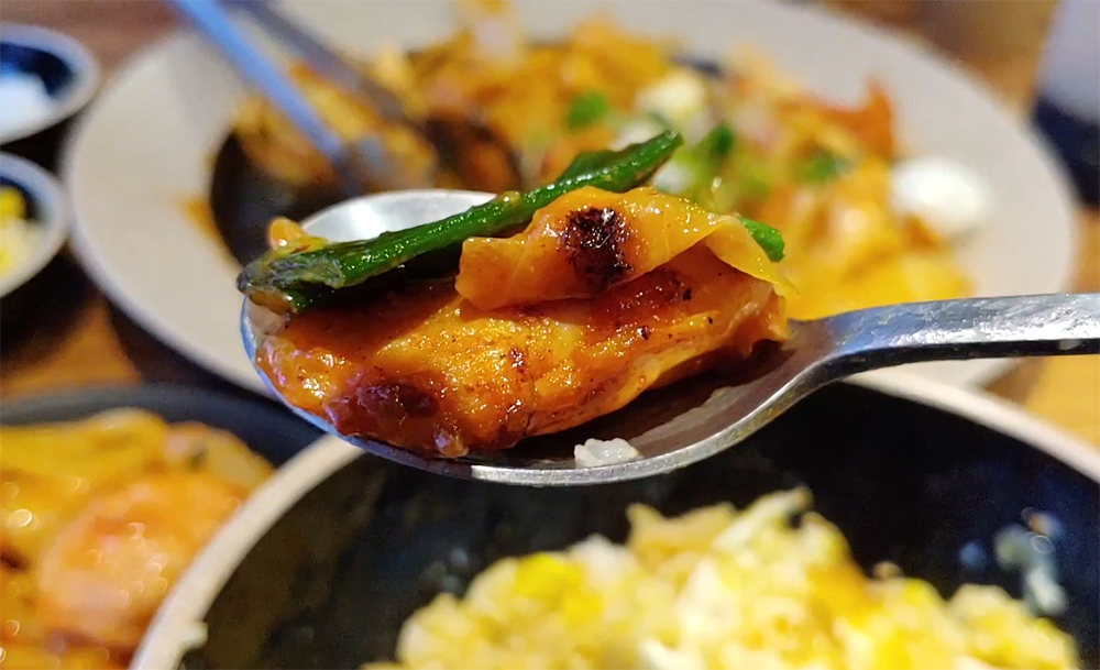마늘편이 들어있는 갈릭닭갈비와 계란 두 개 계란밥입니다.
