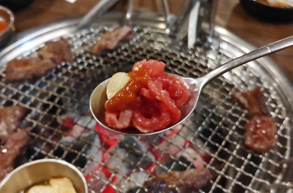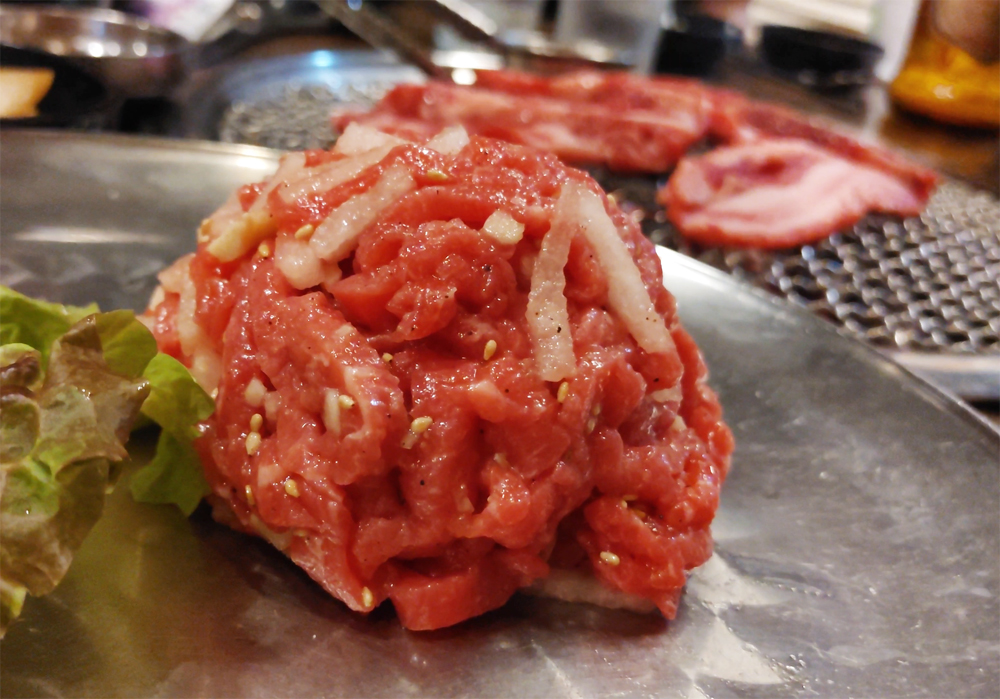 마포역에서 가까운 고깃집 마포목장의 한우 육회, 블랙앵거스 생갈비살 그리고 양념갈비살입니다.